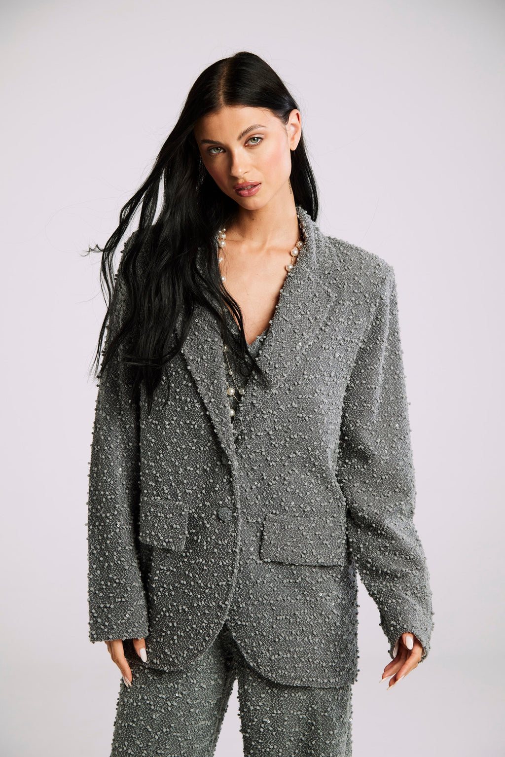O blazer Céleste traduz o charme atemporal da alfaiataria francesa com uma proposta contemporânea e cheia de personalidade. Com modelagem oversized e ombreiras estruturadas, ele proporciona um visual poderoso, sem perder a leveza do tweed com fios botnê e paetês aplicados — um tecido rico em textura e brilho sutil.