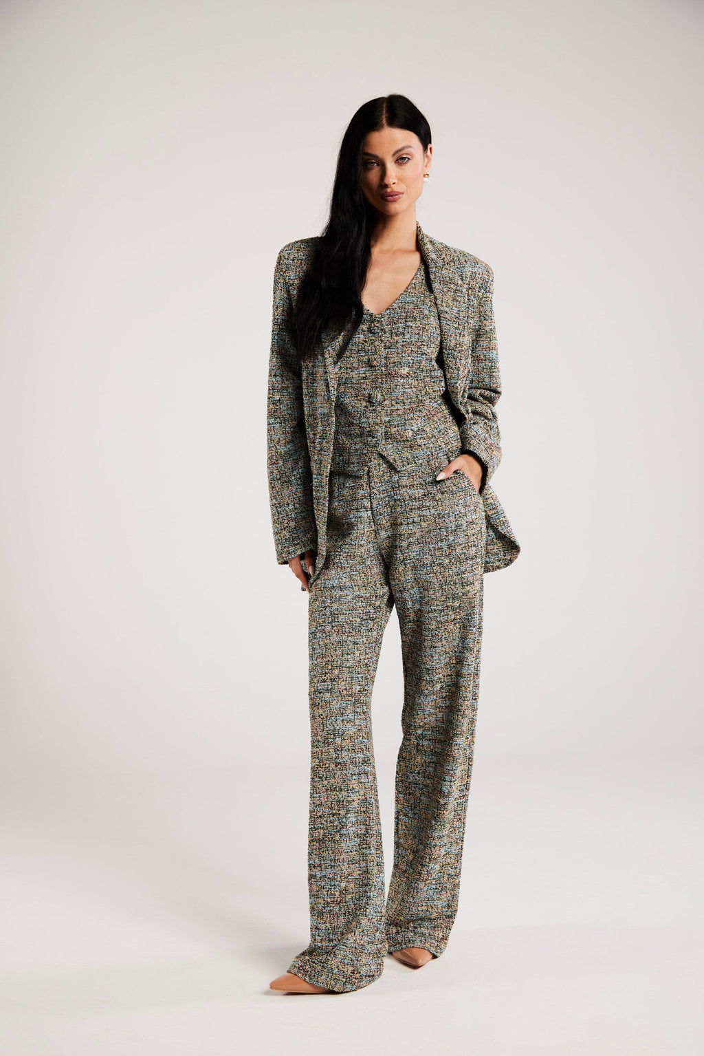 Com caimento impecável e corte reto, a calça de alfaiataria em tweed combina conforto e sofisticacão. Seu design versátil permite combinações que vão do elegante ao casual chic. Feita com um tecido estruturado e ao mesmo tempo confortável, é a escolha ideal para quem busca um visual clássico com um toque contemporâneo.