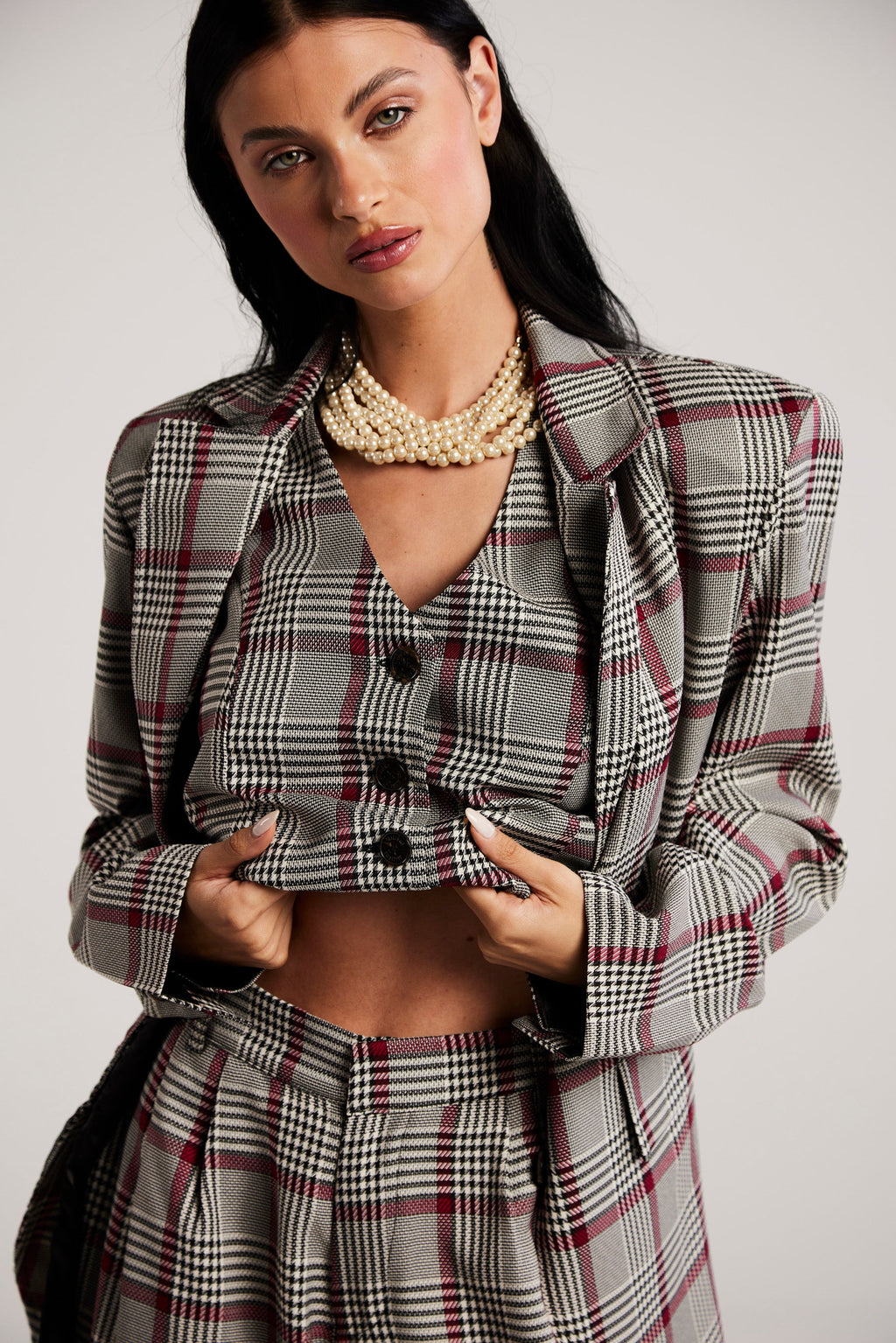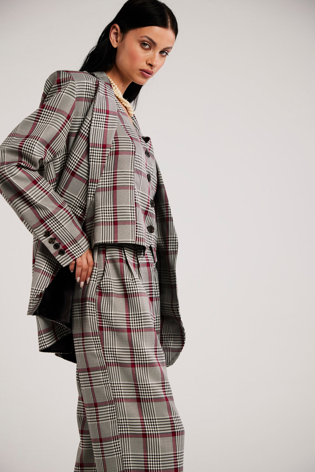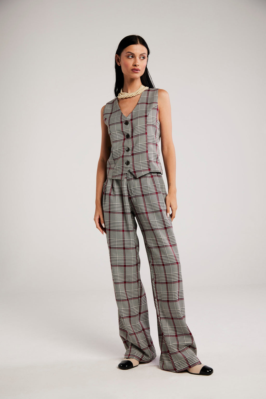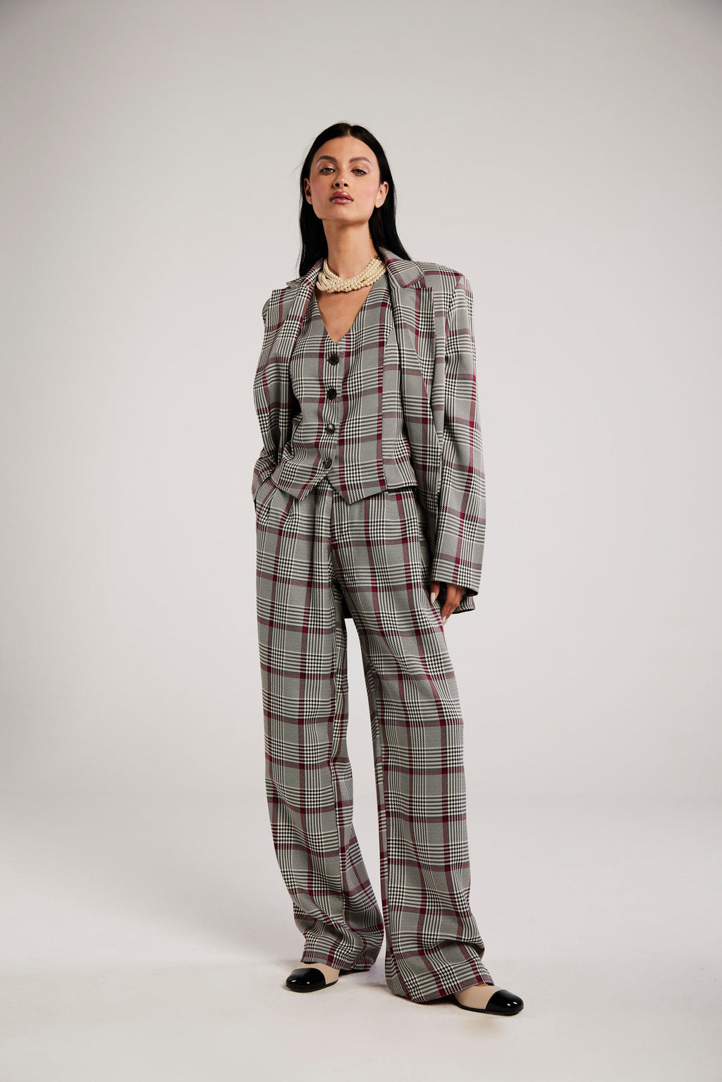 Com uma alfaiataria refinada e silhueta ampla, essa calça traduz o espírito da mulher francesa moderna — elegante, segura e atemporal. Confeccionada em tecido encorpado com padronagem príncipe de gales e toque de vinho, a peça conta com duas pregas frontais que adicionam sofisticação e fluidez ao caimento. Possui bolsos laterais funcionais, fecho por gancho e zíper embutido, além de passantes para cinto, reforçando sua versatilidade. Um clássico com personalidade, perfeita para compor desde looks urbanos até produções mais formais com um toque de irreverência parisiense.