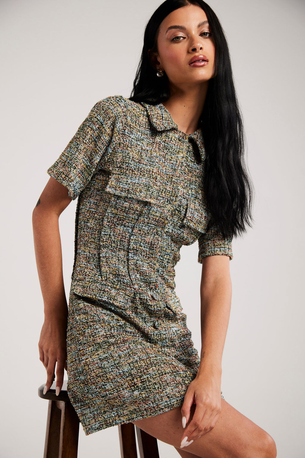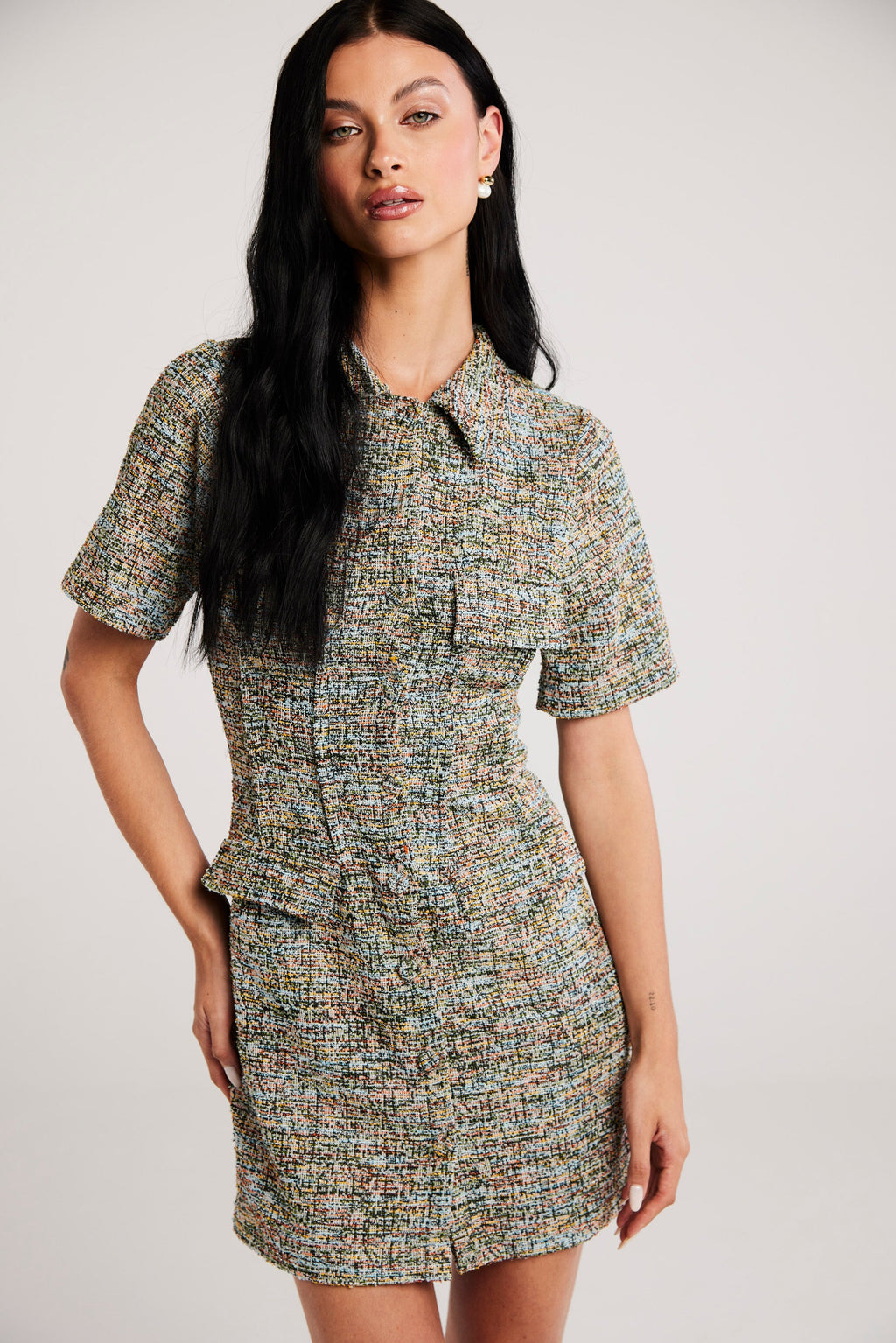 Este vestido em tweed é a perfeita tradução da elegância clássica com um toque contemporâneo. Sua modelagem com pences cuidadosamente posicionadas na frente e nas costas, realça a silhueta de forma refinada e sofisticada. As lapelas aplicadas conferem um charme extra, remetendo ao luxo e à alfaaitaria impecável de alta moda.
